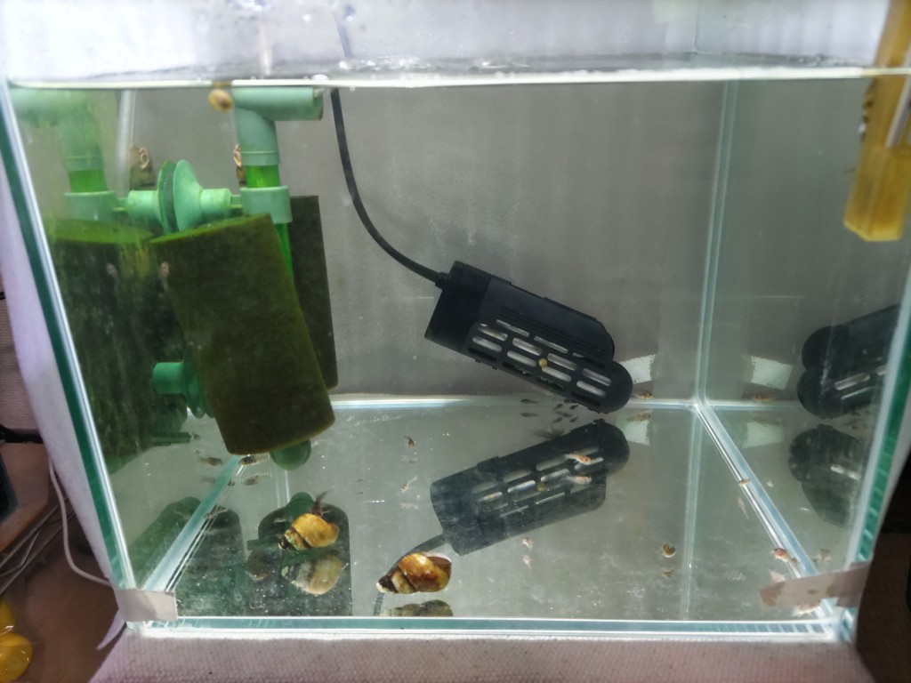 ただやはり完全にきれいに底に溜まったアルテミアを食べてくれるわけではないので、スクレイパーで底にこびりついたアルテミアを剥がしてスポイトでこまめに取り除く作業は必要です。ヒメタニシはちょっと掃除を楽にするくらいの感覚で導入するのがいいでしょう。いなくても問題ありません。