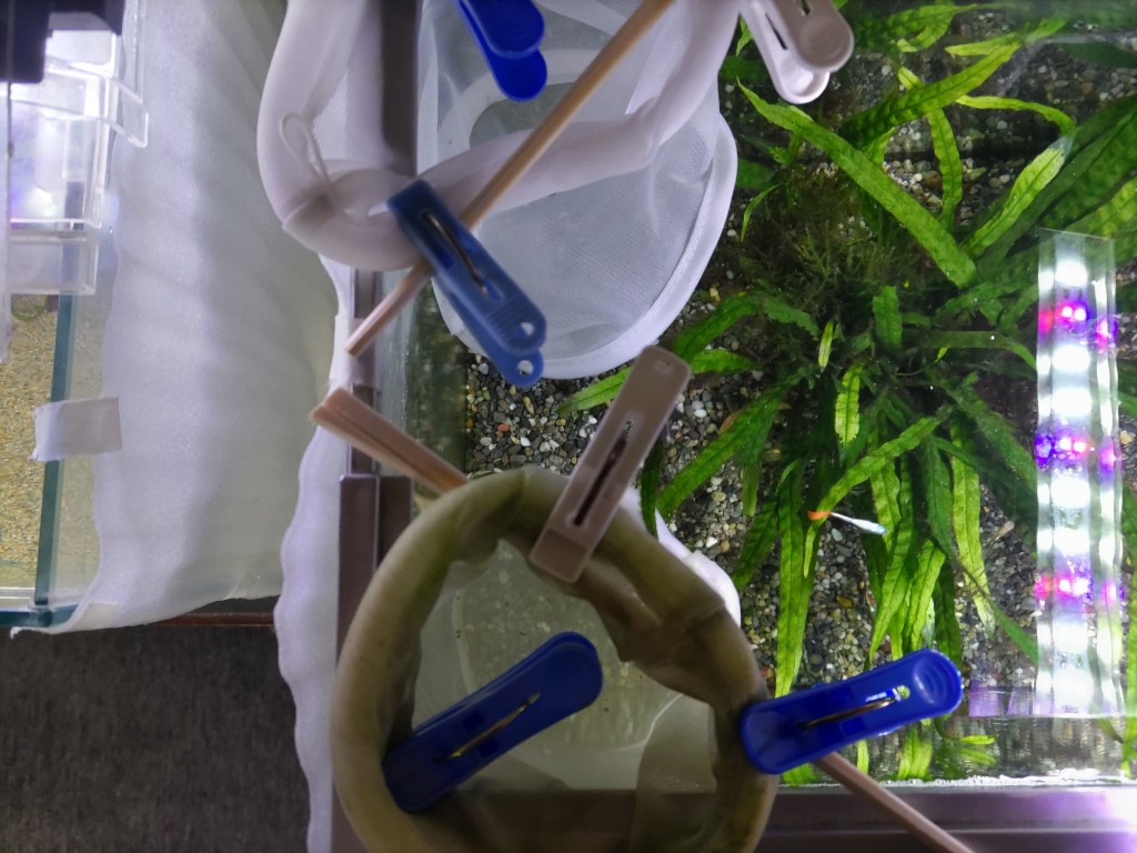 温度が重要そうなので26℃管理の熱帯魚水槽に稚魚用ネットを浮かべて2〜3日待ってみました。