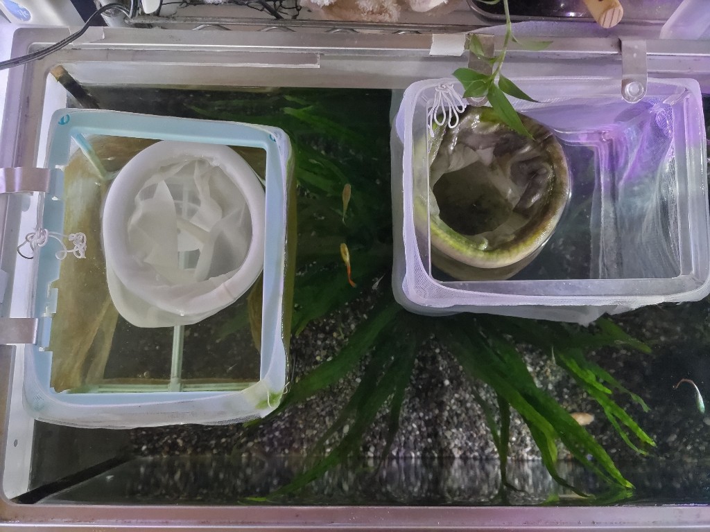そして右上の浮くネットの孵化がすべて完了したら洗って再設置して卵を入れます。すると今度はこの産卵ネットが「成長した稚魚」「生まれたばかりの卵」のネットになります。
